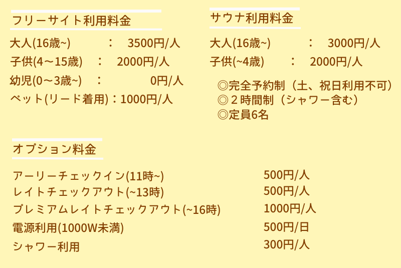 料金表を一覧にまとめました。設備はフリーサイトの他に、サウナ、シャワー、炊事場、トイレなどがあります。